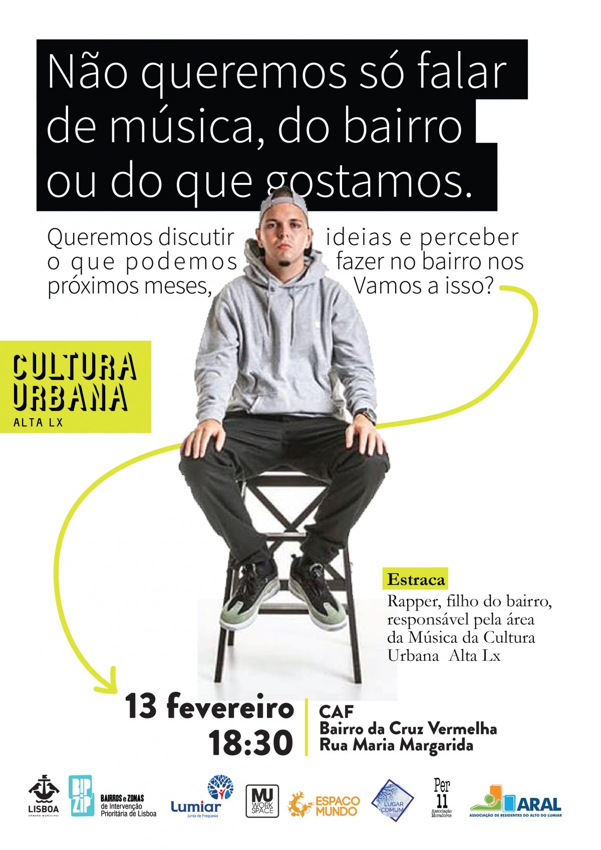 No dia 12 de fevereiro tivemos uma conversa com o Estraca no CAF do Bairro Cruz Vermelha, o objectivo era discutir ideias e perceber o que poderemos fazer na área da música no território. A participação foi grande, muita energia e novas ideias. Agora é fazer acontecer!